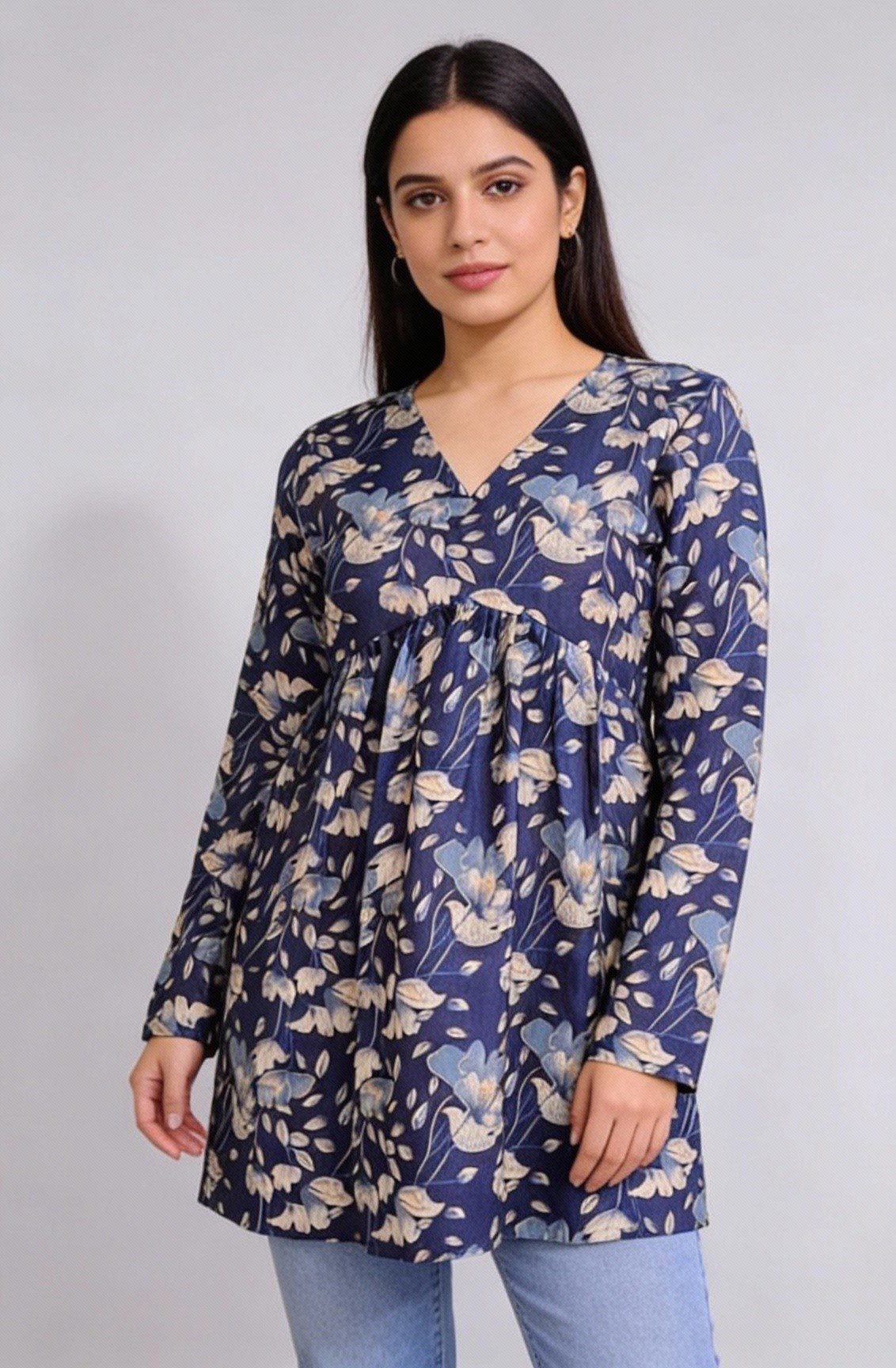 Add timeless elegance to your ethnic wardrobe with this dark blue pleated short kurti for women. Designed with neat front pleats, this kurti offers a flattering silhouette and a polished look. The rich dark blue shade enhances its versatility, making it suitable for daily wear, office wear, and casual outings. Crafted from comfortable, breathable fabric, it pairs effortlessly with jeans, leggings, or trousers for a modern ethnic-fusion style.
